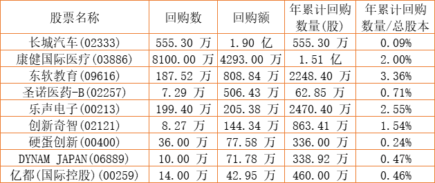 DYNAM JAPAN(06889)、亿都(国际控股)(00259)、创新奇智(02121)、长城汽车(02333)、康健国际医疗(03886)、民银资本(01141)、东软教育(09616)、乐声电子(00213)、硬蛋创新(00400)、圣诺医药-B(02257)于2022年7月29日进行了回购。其中,回购金额最大的为长城汽车(02333),回购数量555.30 万,回购金额1.90 亿元。