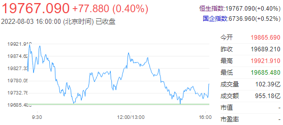 截至收盘,恒生指数(19767.09 77.88 0.40%)涨0.40%,报19767.09点,国企指数涨0.52%,红筹指数跌0.71%。恒生科技指数(4246.13 52.09 1.24%)涨超1%,万国数据涨超7%,阿里巴巴涨近4%,快手涨3.59%。港股后市方面:港股上午收升120点,午后曾再扩大升幅至近200点。唯资金的流走,以致欠缺动力,恒指也见再逐步收窄升幅。香港金管局连日在市场承接港元沽盘,资金逐见大幅撤走。而到本港银行同业拆息亦跟随上升。自第二季开始,本港基准利率已升超过225点子,但1个月和3个月的同业拆息仅升超过百点子和163点子。而银行结余亦见逐步缩减。因此市场上预计,到9月下旬,金管局会上调最优惠利率(P)75点子。相信到时会影响房地产市场的按揭及股票市场。