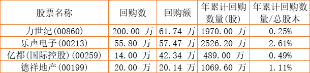 德祥地产(00199)、亿都(国际控股)(00259)、力世纪(00860)、乐声电子(00213)于2022年8月2日进行了回购。其中,回购金额最大的为力世纪(00860),回购数量200.00 万,回购金额61.74 万元。