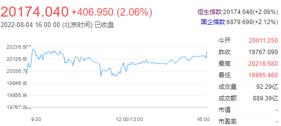截止收盘,恒生指数(20174.039 406.95 2.06%)涨2.06%,报20174.04点,国企指数涨2.12%,红筹指数涨0.66%。恒生科技指数(4381.12 134.99 3.18%)涨超3%,阿里涨超5%,百度涨超4%,哔哩哔哩涨近6%。港股后市方面:港股上午收升287点。午后继续造好,更再扩大升幅,唯仅在近高位的窄幅区间内波动。在7月份的标普香港采购经理指数PMI报52.3,比6月份的52.4见轻微回落。虽然比上略见放缓,但仍连续4个月企稳在50以上的扩张区。反映出经济增长持续改善。需求转见增加,新订单继续稳定,企业为扩充库存而提升采购活动。各企业亦由原先的忧虑而转为乐观。