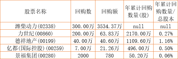 潍柴动力(02338)、力世纪(00860)、德祥地产(00199)、亿都(国际控股)(00259)、景福集团(00280)于2022年08月03日进行了回购。其中,回购金额最大的为潍柴动力(02338),回购数量300.00万 ,回购金额3534.37万。