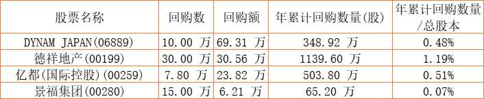 景福集团(00280)、德祥地产(00199)、DYNAM JAPAN(06889)、亿都(国际控股)(00259)于2022年8月4日进行了回购。其中,回购金额最大的为DYNAM JAPAN(06889),回购数量10.00 万,回购金额69.31 万元。