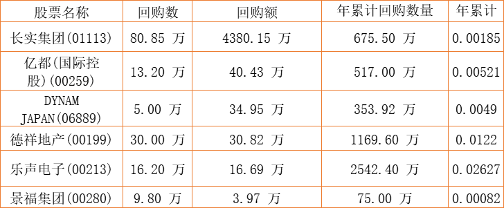 景福集团(00280)、德祥地产(00199)、DYNAM JAPAN(06889)、亿都(国际控股)(00259)、乐声电子(00213)、长实集团(01113)于2022年8月5日进行了回购。其中,回购金额最大的为长实集团(01113),回购数量80.85 万,回购金额4380.15 万元。