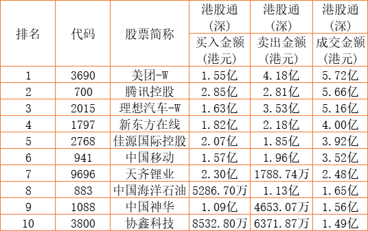 港股通(深)买卖前十股(单位:港元):