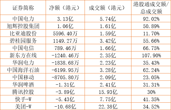 亚汇网8月17日港股通数据统计显示:中国电力净买入额居首,达3.13亿港元,美团-W净卖出额居第一位。(亚汇网编辑:陌尘)