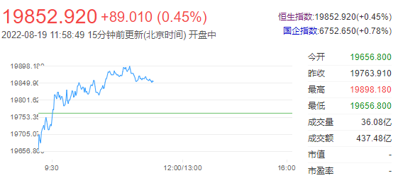 截至午间收盘,恒生指数(19858.68 94.77 0.48%)涨0.45%,报19852.92点;国企指数涨0.78%,红筹指数涨1.11%。恒生科技指数(4229.4 36.76 0.88%)涨0.79%,阅文集团(31.1 2.00 6.87%)涨6.19%,快手涨4.95%,腾讯涨1.92%。
