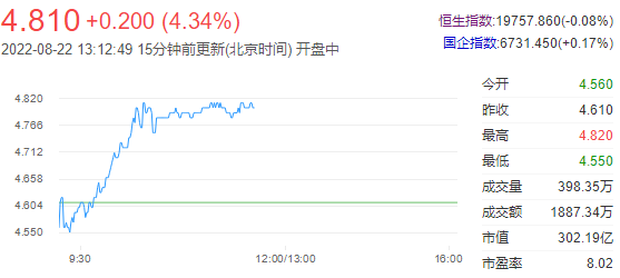 今日走势分析:华润医药(03320)午前涨超4%,截至发稿,涨4.12%,报4.8港元,成交额1592.32万港元。