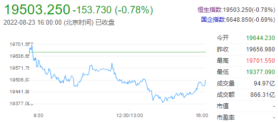 截至收盘,恒生指数跌0.78%或153.73点,报19503.25点,全日成交额866.31亿港元;国企指数跌0.69%,报6648.85点;恒生科技指数跌0.26%,报4141.04点。港股后市展望:港股上午收跌96点。午后受累外围美股期货曾见急挫,恒指再扩大跌幅至低见19377,最多跌超过279点。香港金管局公布,年内第7批银色债券今日开始申请认购。是次发行规模350亿港元,唯可按情况或需求上调至450亿港元。年期为3年,2025年到期,每万元1手,每半年派息1次。仍然是跟通胀挂钩的利率,但今次不会低于4厘,为发行银色债券以来最高。由于以往的认购反应热烈,因此可将上限增至450亿港元。每人可申请上限为百手,即100万港元,但不可重复申请。