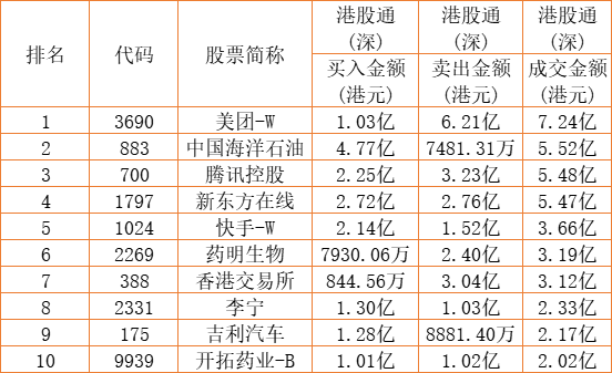 亚汇网实时数据统计:截至8月23日收盘,美团-W、腾讯控股、中国海洋石油位居港股通(沪)成交前三,美团-W、中国海洋石油、腾讯控股位居股通(深)成交前三。