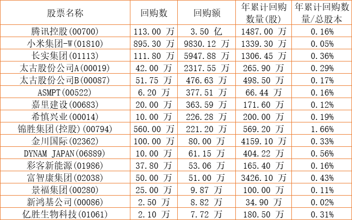 景福集团(00280)、金川国际(02362)、新鸿基公司(00086)、天福(06868)、ASMPT(00522)、希慎兴业(00014)、DYNAM JAPAN(06889)、腾讯控股(00700)、嘉里建设(00683)、长实集团(01113)、亿胜生物科技(01061)、彩客新能源(01986)、太古股份公司A(00019)、太古股份公司B(00087)、锦胜集团(控股)(00794)、小米集团-W(01810)于2022年8月24日进行了回购。其中,回购金额最大的为腾讯控股(00700),回购数量113.00 万,回购金额3.50 亿元。