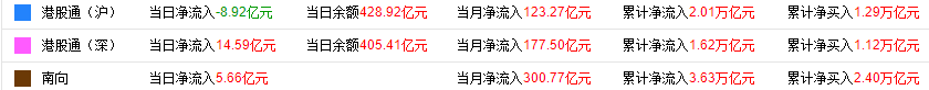 截至8月25日港股收盘,南向资金全日合计净流入5.66亿港元。其中,沪市港股通净流出8.92亿港元,深市港股通净流入14.59亿港元。