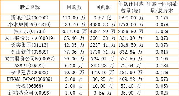 新鸿基公司(00086)、天福(06868)、亿胜生物科技(01061)、腾讯控股(00700)、DYNAM JAPAN(06889)、长实集团(01113)、嘉里建设(00683)、太古股份公司A(00019)、太古股份公司B(00087)、小米集团-W(01810)、易大宗(01733)、金山软件(03888)于2022年8月25日进行了回购。其中,回购金额最大的为腾讯控股(00700),回购数量110.00 万,回购金额3.52 亿元。