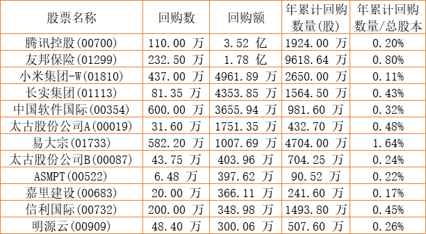 天福(06868)、亿胜生物科技(01061)、彩星集团(00635)、希慎兴业(00014)、DYNAM JAPAN(06889)、伟仕佳杰(00856)、信利国际(00732)、腾讯控股(00700)、赛晶科技(00580)、中国旭阳集团(01907)、嘉里建设(00683)、中国软件国际(00354)、友邦保险(01299)、明源云(00909)、易大宗(01733)、联易融科技-W(09959)、太古股份公司A(00019)、长实集团(01113)、太古股份公司B(00087)、小米集团-W(01810)、康圣环球(09960)、和谐汽车(03836)、ESR(01821)于2022年8月30日进行了回购。其中,回购金额最大的为腾讯控股(00700),回购数量110.00 万,回购金额3.52 亿元。