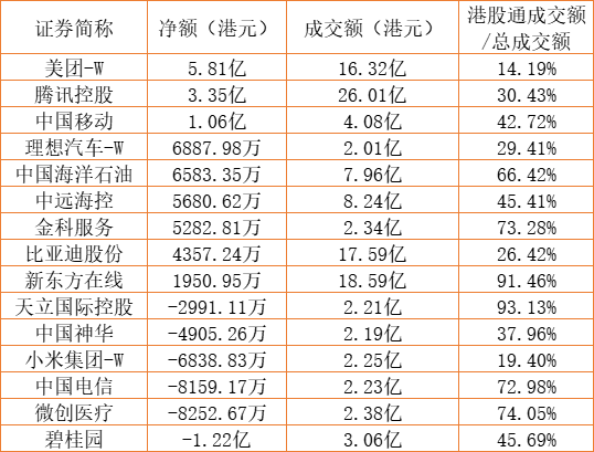 亚汇网8月31日港股通数据统计显示:美团-W净买入额居首,达5.81亿港元,碧桂园净卖出额居第一位。(亚汇网编辑:陌尘)
