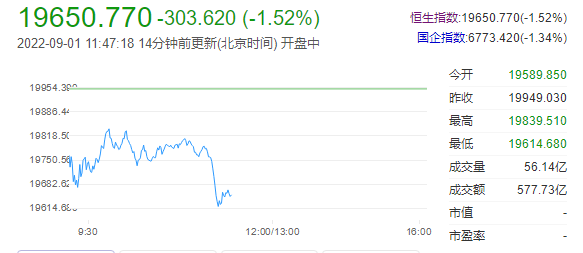 今日港股低开低走,截至午盘,恒生指数跌1.52%,报19650.77点,国企指数跌1.34%,红筹指数跌0.23%。
