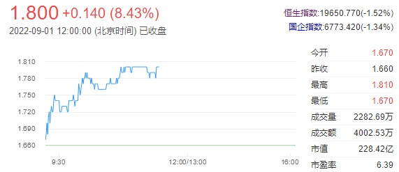 今日走势分析:内房股早盘普涨,截至发稿,中国金茂(00817)涨7.83%,报1.79港元;富力地产(02777)涨7.98%,报1.76港元;合景泰富集团(01813)涨4.93%,报1.49港元;新城发展(01030)涨3.82%,报2.72港元。