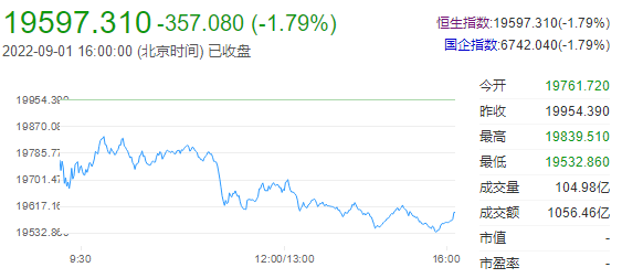 截至收盘,恒生指数跌1.79%,报19597.31点,国企指数跌1.79%,红筹指数跌0.98%。港股后市展望:港股上午收市前再遇沽压,并扩大跌幅,最后以近低位跌303点收市。午后延续跌势,更扩大跌幅至低见19537,最多跌417点。恒指在8月最后一日微升5点收市。整月累计跌202点。月内最高20283,唯未见创新高,但曾造出近3个月低位19189。日平均成交更不足千亿港元。今日开始踏入9月,已见跟外围大幅急挫。持续的劣势,短期内也难有办法改变。暂时离场,继续观望,等待机会。