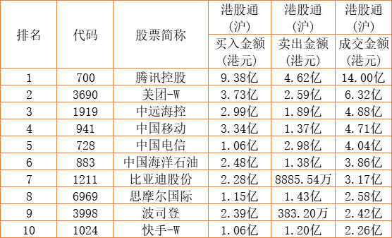港股通(沪)买卖前十股(单位:港元):