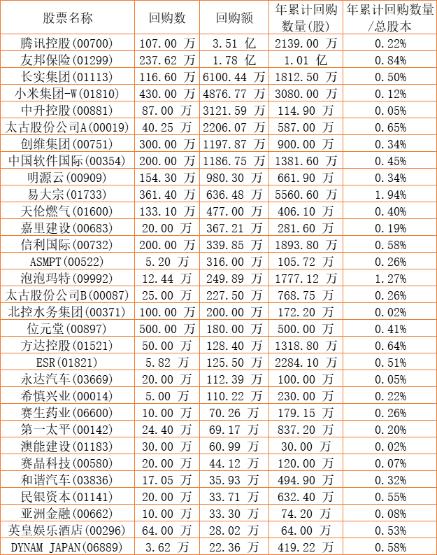 亿胜生物科技(01061)、腾讯控股(00700)、天福(06868)、DYNAM JAPAN(06889)、信利国际(00732)、彩星集团(00635)、新鸿基公司(00086)、天伦燃气(01600)、希慎兴业(00014)、民银资本(01141)、位元堂(00897)、德祥地产(00199)、友邦保险(01299)、长实集团(01113)、嘉里建设(00683)、太古股份公司A(00019)、太古股份公司B(00087)、泡泡玛特(09992)、方达控股(01521)、锦胜集团(控股)(00794)、赛晶科技(00580)、北控水务集团(00371)、瑞安建业(00983)、明源云(00909)、易大宗(01733)、东软教育(09616)、英皇娱乐酒店(00296)、圣诺医药-B(02257)、乐声电子(00213)、小米集团-W(01810)、康圣环球(09960)、ESR(01821)、中升控股(00881)、永达汽车(03669)、第一太平(00142)、和谐汽车(03836)、赛生药业(06600)于2022年9月1日进行了回购。其中,回购金额最大的为腾讯控股(00700),回购数量107.00 万,回购金额3.51 亿元。