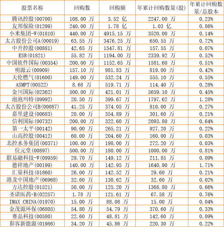 天福(06868)、澳能建设(01183)、ASMPT(00522)、新鸿基公司(00086)、中国软件国际(00354)、金茂源环保(06805)、彩星集团(00635)、民银资本(01141)、信利国际(00732)、DYNAM JAPAN(06889)、保发集团(03326)、第一太平(00142)、德祥地产(00199)、位元堂(00897)、腾讯控股(00700)、彩客新能源(01986)、嘉里建设(00683)、IMAX CHINA(01970)、锦胜集团(控股)(00794)、友邦保险(01299)、中国科培(01890)、ESR(01821)、联易融科技-W(09959)、方达控股(01521)、艾德韦宣集团(09919)、东软教育(09616)、明源云(00909)、星光集团(00403)、北控水务集团(00371)、天伦燃气(01600)、赛晶科技(00580)、泡泡玛特(09992)、英皇娱乐酒店(00296)、太古股份公司A(00019)、清科创业(01945)、太古股份公司B(00087)、赛生药业(06600)、山高控股(00412)、圣诺医药-B(02257)、汇量科技(01860)、金川国际(02362)、小米集团-W(01810)、康圣环球(09960)、中升控股(00881)、港龙中国地产(06968)、和谐汽车(03836)、知乎-W(02390)于2022年9月2日进行了回购。其中,回购金额最大的为腾讯控股(00700),回购数量108.00 万,回购金额3.52 亿元。