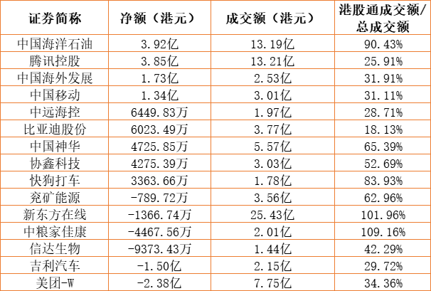 亚汇网9月6日港股通数据统计显示:中国海洋石油净买入额居首,达3.92亿港元,美团-W净卖出额居第一位。(亚汇网编辑:陌尘)