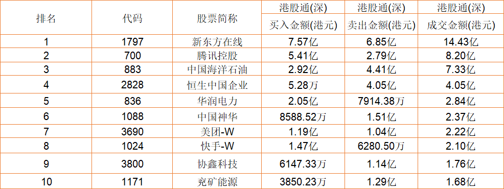 亚汇网实时数据统计:截至9月8日收盘,腾讯控股、恒生中国企业、中国海洋石油居港股通(沪)成交前三,新东方在线、腾讯控股、中国海洋石油位居股通(深)成交前三。