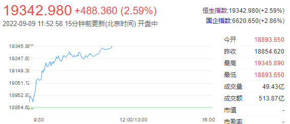 截至午间收盘,港股恒指涨2.59%,报19342.98点;国企指数涨2.86%,红筹指数涨2.57%。恒生科技指数涨2.76%,蔚来涨5.43%,美团涨5.25%,网易涨4.69%。