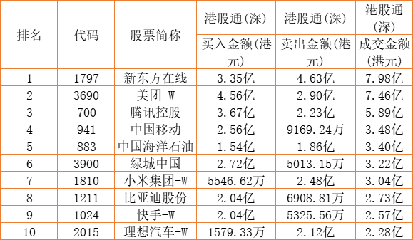 亚汇网实时数据统计:截至9月9日收盘,腾讯控股、美团-W、中国移动居港股通(沪)成交前三,新东方在线、美团-W、腾讯控股位居股通(深)成交前三。