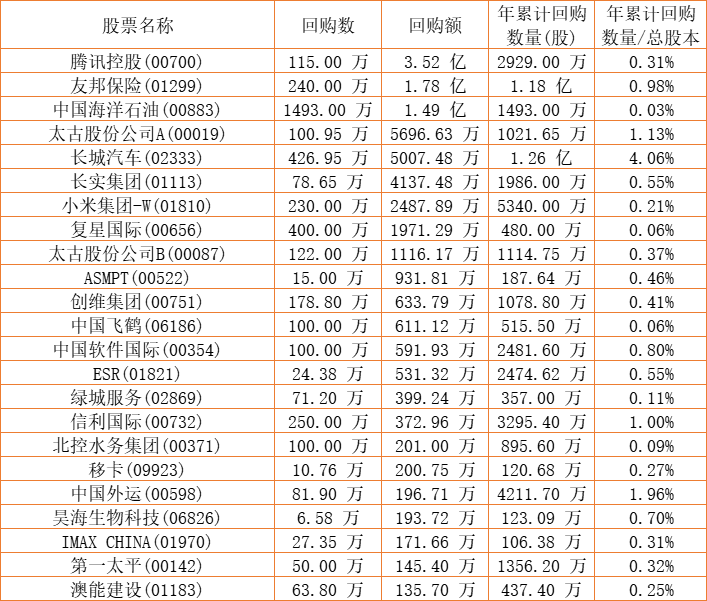 第一太平(00142)、中国外运(00598)、澳能建设(01183)、维信金科(02003)、绿城服务(02869)、ASMPT(00522)、康健国际医疗(03886)、昊海生物科技(06826)、IMAX CHINA(01970)、腾讯控股(00700)、建业新生活(09983)、创维集团(00751)、天福(06868)、中国软件国际(00354)、民银资本(01141)、天伦燃气(01600)、清科创业(01945)、祖龙娱乐(09990)、方达控股(01521)、太古股份公司A(00019)、太古股份公司B(00087)、长城汽车(02333)、瑞安建业(00983)、信利国际(00732)、德祥地产(00199)、乐声电子(00213)、友邦保险(01299)、赛晶科技(00580)、山高控股(00412)、英皇娱乐酒店(00296)、创梦天地(01119)、长实集团(01113)、中国海洋石油(00883)、北控水务集团(00371)、移卡(09923)、复星国际(00656)、小米集团-W(01810)、硬蛋创新(00400)、中国飞鹤(06186)、康圣环球(09960)、港龙中国地产(06968)、永达汽车(03669)、圣诺医药-B(02257)、ESR(01821)、知乎-W(02390)于2022年9月13日进行了回购。其中,回购金额最大的为腾讯控股(00700),回购数量115.00 万,回购金额3.52 亿元。