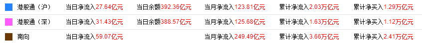 9月14日,南下资金净流入59.06亿港元,其中港股通(沪)净流入27.63亿港元,港股通(深)净流入31.43亿港元。