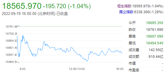 9日19日下午,港股收盘,行情低开低走,香港恒生指数跌1.04%,报18565.97点;恒生科技指数跌2.07%,报3778.77点 。市场呈跌多涨少态势。盘面上燃气、虚拟现实、富士康概念、房地产服务等行业或概念板块走强。百货业、京东概念、生物科技、制药、军工等行业或概念板块走弱。地产板块跌幅居前,旭辉控股集团跌近10%,合景泰富集团、碧桂园服务、富力地产、龙湖集团跌超6%。回港中概股持续走低,新东方跌超8%,知乎跌超6%,哔哩哔哩跌近6%,阿里巴巴跌超3%;新能源汽车板块走低,蔚来跌超6%,理想汽车跌超5%,小鹏汽车跌超4%。港股后市展望:兴证国际表示,当前港股弱势无疑,但下行空间逐渐有限,3月份低点18200点附近料有较强支撑。投资策略上,继续秉承防守反击思路。防守,首先是要选守得住的品种,估值低、财务稳、派息高;反击,则有要市场号召力,要有向上的空间,这由标的所在行业景气度、公司成长性和经营水平来决定。