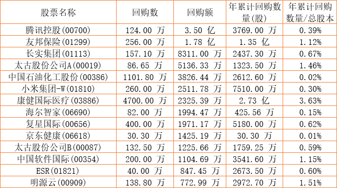 澳能建设(01183)、新鸿基公司(00086)、祖龙娱乐(09990)、北控水务集团(00371)、清科创业(01945)、彩星集团(00635)、福寿园(01448)、瑞安房地产(00272)、中国软件国际(00354)、亚洲金融(00662)、中国石油化工股份(00386)、希慎兴业(00014)、第一太平(00142)、DYNAM JAPAN(06889)、昊海生物科技(06826)、伟仕佳杰(00856)、民银资本(01141)、天伦燃气(01600)、星光集团(00403)、联易融科技-W(09959)、天福(06868)、中手游(00302)、维信金科(02003)、德祥地产(00199)、春立医疗(01858)、康健国际医疗(03886)、酷派集团(02369)、泡泡玛特(09992)、现代牙科(03600)、兴胜创建(00896)、京东健康(06618)、亿都(国际控股)(00259)、太古股份公司A(00019)、康哲药业(00867)、金川国际(02362)、太古股份公司B(00087)、港龙中国地产(06968)、友邦保险(01299)、小米集团-W(01810)、复星国际(00656)、赛晶科技(00580)、东软教育(09616)、圣诺医药-B(02257)、方达控股(01521)、明源云(00909)、长实集团(01113)、商汤-W(00020)、创胜集团-B(06628)、腾讯控股(00700)、乐声电子(00213)、中远海运国际(00517)、移卡(09923)、汇量科技(01860)、彩客新能源(01986)、ESR(01821)、海尔智家(06690)、永达汽车(03669)、康圣环球(09960)、中原建业(09982)、知乎-W(02390)于2022年9月22日进行了回购。其中,回购金额最大的为腾讯控股(00700),回购数量124.00 万,回购金额3.50 亿元。