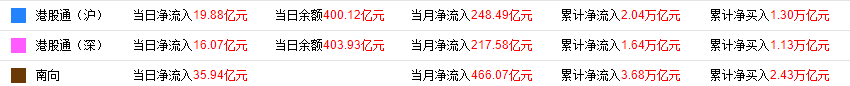 9月23日,南下资金净流入35.93亿港元,其中港股通(沪)净流入19.87亿港元,港股通(深)净流入16.06亿港元。