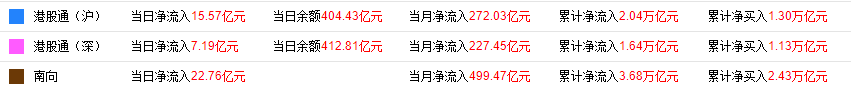 9月27日,南下资金净流入22.57亿港元,其中港股通(沪)净流入15.56亿港元,港股通(深)净流入7.19亿港元。