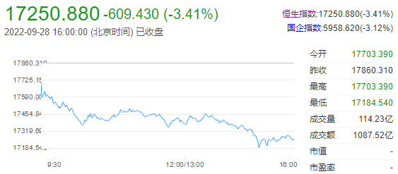 9日28日下午,港股收盘,两大指数大幅低开后继续走低,市场上涨股票仅284只,香港恒生指数跌3.41%,恒生科技指数跌3.85%。港股后市展望:平安证券认为,低估的优质资产多分布在内地和港股市场。就港股市场而言,无论是恒生科技代表的资讯科技业,还是可选消费、制造业龙头,估值都已经非常便宜,长期配置的机会或许已经来临。虽然对于后续中概股监管合作、出口下行的强度和持续时间尚有不确定性,但当前市场计价已经非常悲观,只要中概股监管合作、内地经济修复、出口下行弱于预期、联储紧缩边际趋缓出现1~2个,港股优质资产就有向上修正的强劲动能。