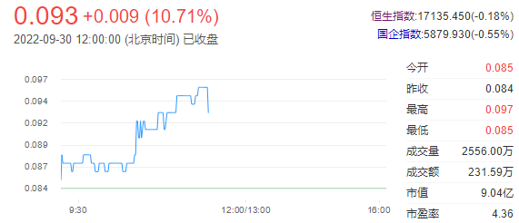 今日走势分析:通达集团(00698)早盘反弹逾14%,截至发稿,涨14.29%,报0.096港元,成交额227.76万港元。