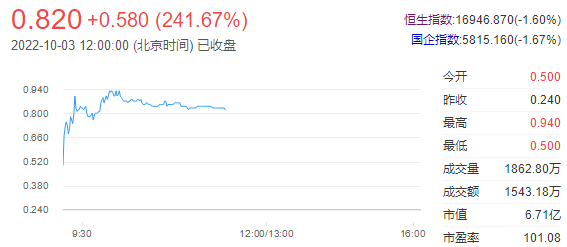今日走势分析:恒富控股(00643)今日复牌,早盘一度暴涨近300%,截至发稿,涨250%,报0.84港元,成交额438.89万港元。