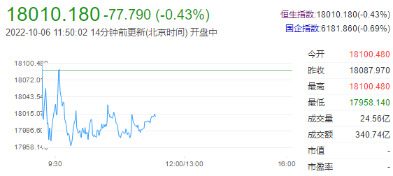 截至10月6日午间休盘,恒生指数跌0.43%,恒生科技指数跌0.91%,新能源汽车股领跌,航空股、智能家居股领涨。