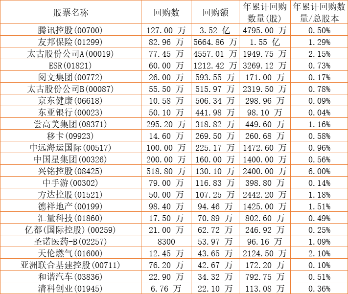 现代牙科(03600)、中国星集团(00326)、晨讯科技(02000)、兴铭控股(08425)、德祥地产(00199)、阅文集团(00772)、维信金科(02003)、亿都(国际控股)(00259)、天福(06868)、澳能建设(01183)、东亚银行(00023)、腾讯控股(00700)、清科创业(01945)、尝高美集团(08371)、中手游(00302)、亚洲联合基建控股(00711)、民银资本(01141)、酷派集团(02369)、友邦保险(01299)、汇量科技(01860)、京东健康(06618)、太古股份公司A(00019)、中远海运国际(00517)、移卡(09923)、太古股份公司B(00087)、方达控股(01521)、天伦燃气(01600)、康圣环球(09960)、和谐汽车(03836)、圣诺医药-B(02257)、ESR(01821)、金利来集团(00533)、知乎-W(02390)于2022年10月5日进行了回购。其中,回购金额最大的为腾讯控股(00700),回购数量127.00 万,回购金额3.52 亿元。