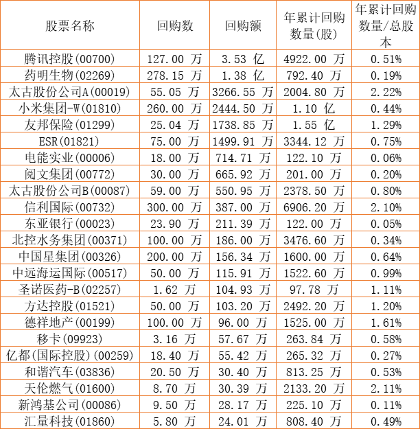 中国星集团(00326)、首佳科技(00103)、摩比发展(00947)、维信金科(02003)、德祥地产(00199)、阅文集团(00772)、方达控股(01521)、亚洲金融(00662)、东亚银行(00023)、中手游(00302)、DYNAM JAPAN(06889)、北控水务集团(00371)、天福(06868)、新鸿基公司(00086)、清科创业(01945)、信利国际(00732)、惠理集团(00806)、亿都(国际控股)(00259)、腾讯控股(00700)、天伦燃气(01600)、电能实业(00006)、汇量科技(01860)、尝高美集团(08371)、创胜集团-B(06628)、中远海运国际(00517)、酷派集团(02369)、小米集团-W(01810)、移卡(09923)、太古股份公司A(00019)、圣诺医药-B(02257)、和谐汽车(03836)、太古股份公司B(00087)、友邦保险(01299)、康圣环球(09960)、药明生物(02269)、金利来集团(00533)、ESR(01821)、知乎-W(02390)于2022年10月6日进行了回购。其中,回购金额最大的为腾讯控股(00700),回购数量127.00 万,回购金额3.53 亿元。