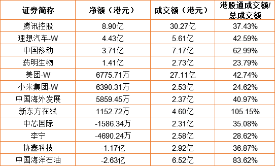 亚汇网10月12日港股通数据统计显示:腾讯控股净买入额居首,达8.90亿港元,中国海洋石油净卖出额居第一位。(亚汇网编辑:陌尘)
