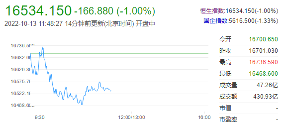 恒指早盘收跌1%,恒生科技指数跌1.7%,已连续6个交易日下跌。恒生科技指数(3216.45 -53.09 -1.62%)跌1.7%,哔哩哔哩跌7%,舜宇光学、阿里健康(3.46 -0.12 -3.35%)、京东集团跌超3%,网易、蔚来、小鹏等跌超2%。
