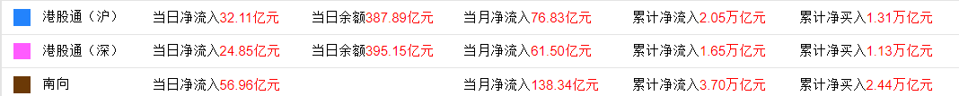 南向资金方面,南下资金净流入56.95亿港元,其中港股通(沪)净流入32.11亿港元,港股通(深)净流入24.84亿港元。