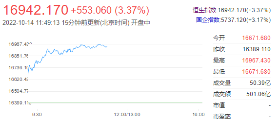 10月14日午间,港股两大指数持续走高,香港恒生指数涨3.37%,恒生科技指数涨3.94%。