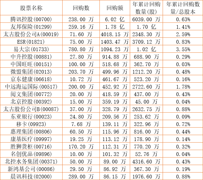 亚洲金融(00662)、亚洲联合基建控股(00711)、亿胜生物科技(01061)、清科创业(01945)、民银资本(01141)、金利来集团(00533)、DYNAM JAPAN(06889)、中国旺旺(00151)、亿都(国际控股)(00259)、新鸿基公司(00086)、东亚银行(00023)、惠理集团(00806)、易大宗(01733)、乐声电子(00213)、北控水务集团(00371)、阅文集团(00772)、天福(06868)、腾讯控股(00700)、友邦保险(01299)、天伦燃气(01600)、祖龙娱乐(09990)、酷派集团(02369)、中远海运国际(00517)、中星集团控股(00055)、名创优品(09896)、创胜集团-B(06628)、胜狮货柜(00716)、港龙中国地产(06968)、ESR(01821)、康基医疗(09997)、澳优(01717)、太古股份公司A(00019)、太古股份公司B(00087)、和谐汽车(03836)、汇量科技(01860)、圣诺医药-B(02257)、摩比发展(00947)、移卡(09923)、中升控股(00881)、京东健康(06618)于2022年10月14日进行了回购。其中,回购金额最大的为腾讯控股(00700),回购数量238.00 万,回购金额6.02 亿元。