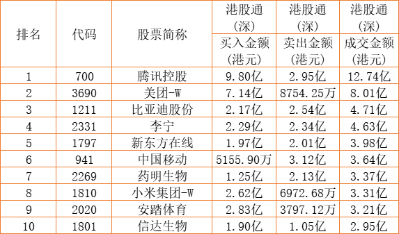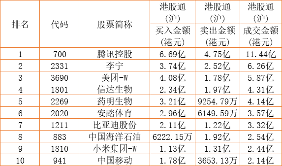 亚汇网实时数据统计:截至10月18日收盘,腾讯控股、李宁、美团-W位居港股通(沪)成交前三,腾讯控股、美团-W、比亚迪股份位居股通(深)成交前三。