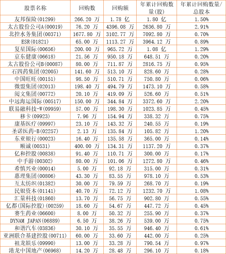 亚洲金融(00662)、亿胜生物科技(01061)、东亚银行(00023)、微盟集团(02013)、希慎兴业(00014)、中手游(00302)、京东健康(06618)、DYNAM JAPAN(06889)、天福(06868)、和谐汽车(03836)、石四药集团(02005)、亿都(国际控股)(00259)、民银资本(01141)、顺诚(00531)、清科创业(01945)、祖龙娱乐(09990)、惠理集团(00806)、中国旺旺(00151)、乐声电子(00213)、汇量科技(01860)、天伦燃气(01600)、新鸿基公司(00086)、北控水务集团(00371)、联易融科技-W(09959)、太古股份公司A(00019)、友邦保险(01299)、太古股份公司B(00087)、酷派集团(02369)、赛晶科技(00580)、亚洲联合基建控股(00711)、复星国际(00656)、中远海运国际(00517)、创胜集团-B(06628)、移卡(09923)、港龙中国地产(06968)、赛生药业(06600)、康圣环球(09960)、筑友智造科技(00726)、康基医疗(09997)、亿和控股(00838)、ESR(01821)、圣诺医药-B(02257)于2022年10月20日进行了回购。其中,回购金额最大的为友邦保险(01299),回购数量266.20 万,回购金额1.78 亿元。