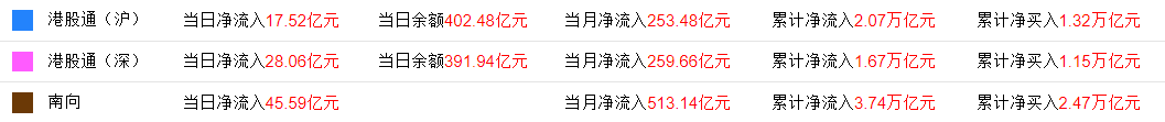 南向资金方面,南下资金净流入45.58亿港元,其中港股通(沪)净流入17.52亿港元,港股通(深)净流入28.06亿港元。