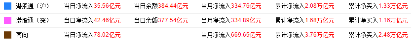 南向资金方面,南下资金净流入78.02亿港元,其中港股通(沪)净流入35.56亿港元,港股通(深)净流入42.46亿港元。