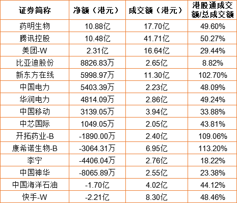 亚汇网10月28日港股通数据统计显示:药明生物净买入额居首,达10.88亿港元,快手-W净卖出额居第一位。(亚汇网编辑:陌尘)